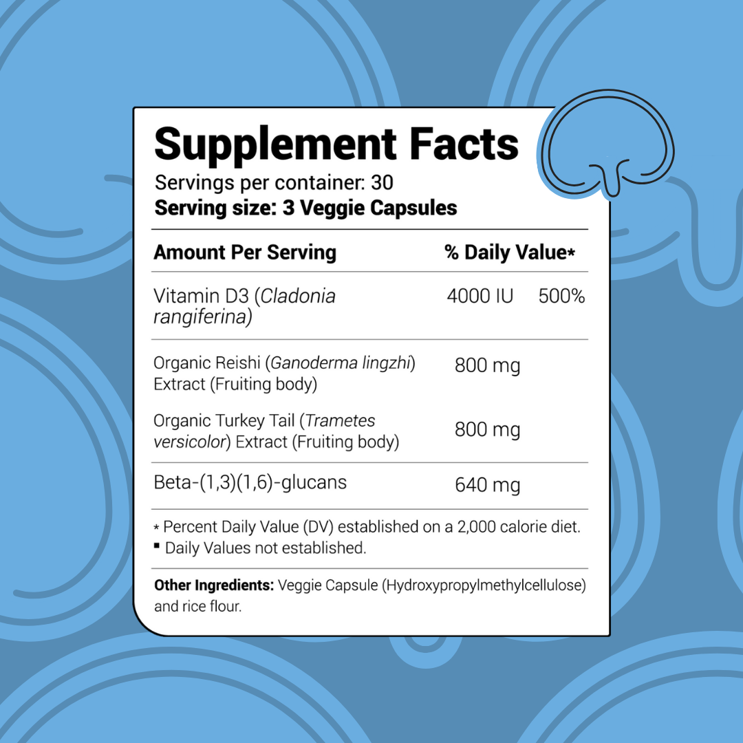 Vitamina D3 vegana (4000 UI), Extracto de Reishi (800mg) y Extracto de Turkey Tail (800mg).